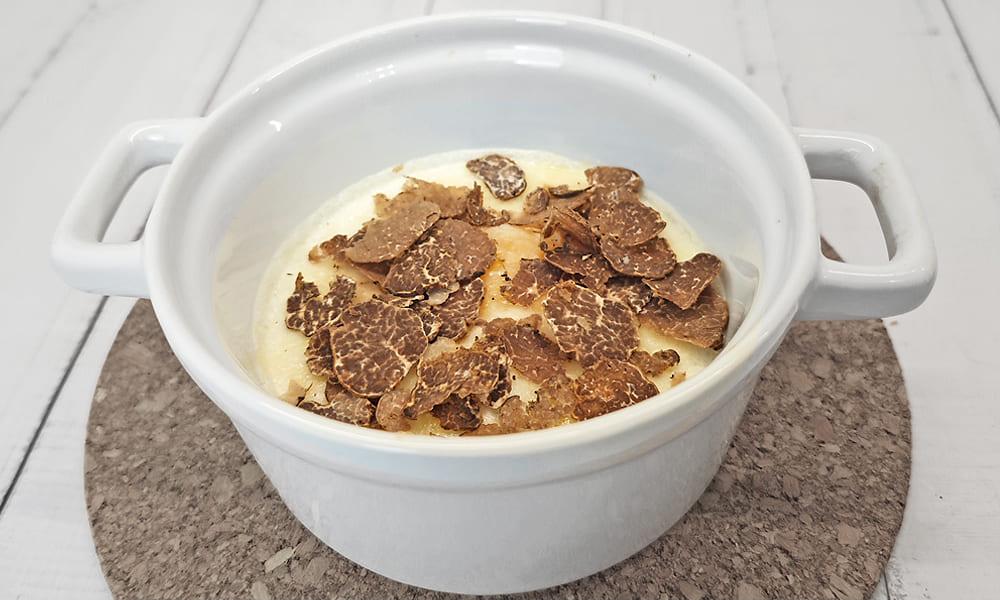 Cuociamo in forno statico preriscaldato a 210° per 7 minuti, se si vuole un tuorlo più sodo proseguire la cottura per ulteriori 2 minuti. Sforniamo aggiungiamo il tartufo a scaglie e serviamo.